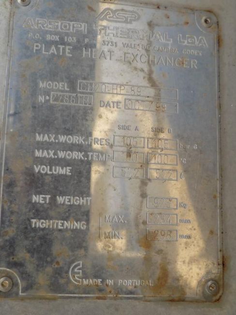 Arsopi Thermal 572 L S/S Plate Heat Exchanger, Model CH20-HP-89, S/N 2786TH with S/S Plates, MWP 10.5 Bar, MAWT 100 Degree C Bar Max : 10.5