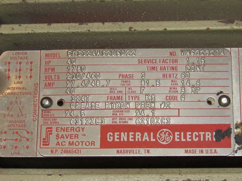 40-HP GE Energy Saver High Speed Electric Motor Model #5KS324AS205D22, 230/460 Volts, 97.4/48.7 Amps, 324T Frame, 1780 RPM . Removal and loading charges are included -Optional Palletizing Fee $75.00 Located in Iowa