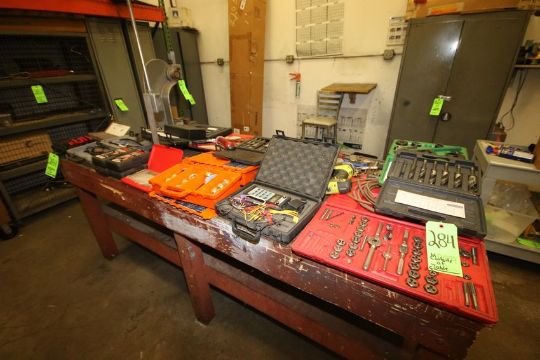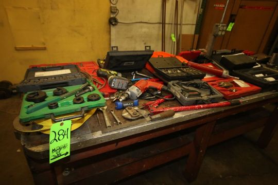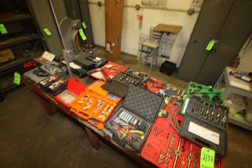 Contents of Shop Table includes Tool & Die Set, Drill Sets, Hand Tools, Knockout Punch Set, Milwaukee Electric Drill, Brass Plumbing Fittings, Calibration Set and Other Present Contents ***LOADING FEE:  $25.00 (LOADED AS IS; OTHER REQUESTS MAY BE ADDITIONAL CHARGE)***
