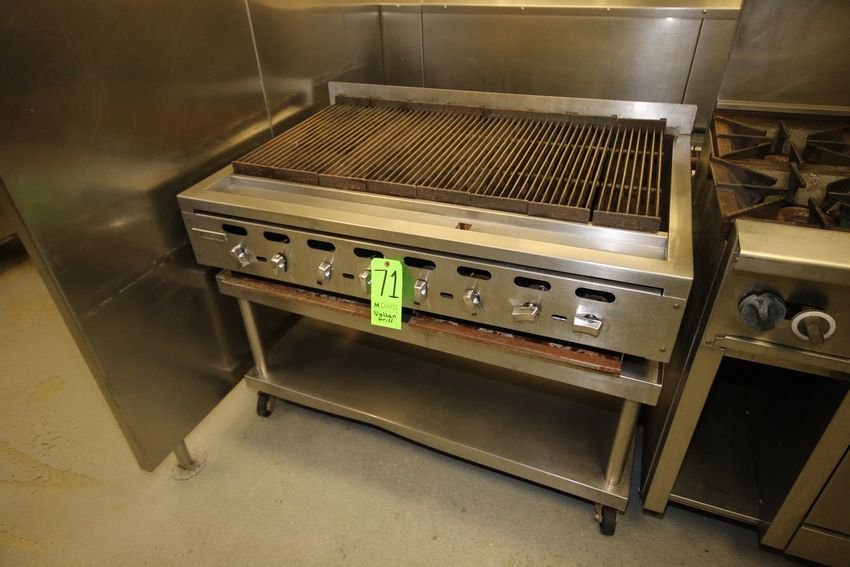 Vulcan 42" L x 23" W Natural Gas Charbroiler, Model VACB47-101, S/N 650106794, 8-Knob, Unit Rating 136,000 BATU/Hr., Mounted on Portable S/S Table with Bottom Shelf ***LOADING FEE:  $50.00 (LOADED AS IS; OTHER REQUESTS MAY BE ADDITIONAL CHARGE)***