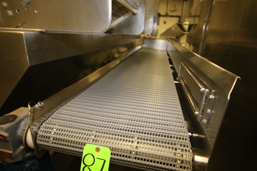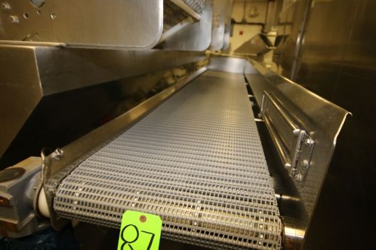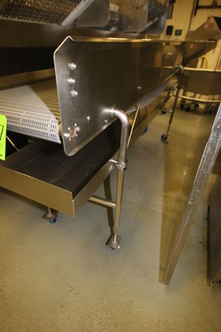 Aprox. 110" L x 17-1/2" W Portable S/S Discharge Drainage Conveyor with Belt, Drain Pan and Drive, Mounted on S/S Frame ***LOADING FEE:  $50.00 (LOADED AS IS; OTHER REQUESTS MAY BE ADDITIONAL CHARGE)***