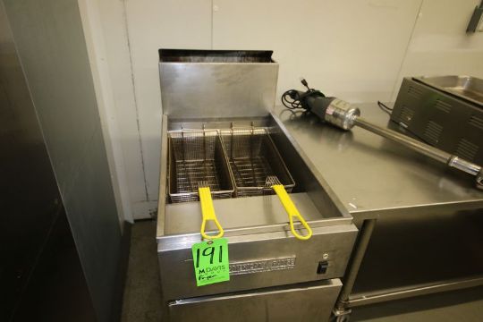 American Range Natural Gas Dual Basket Fryer, Mounted on Portable Frame, Basket Dimensions Aprox. 17" L x 8" W x 6" Deep ***LOADING FEE:  $50.00 (LOADED AS IS; OTHER REQUESTS MAY BE ADDITIONAL CHARGE)***