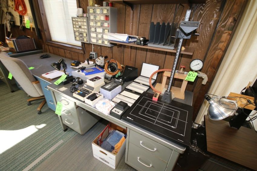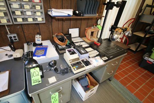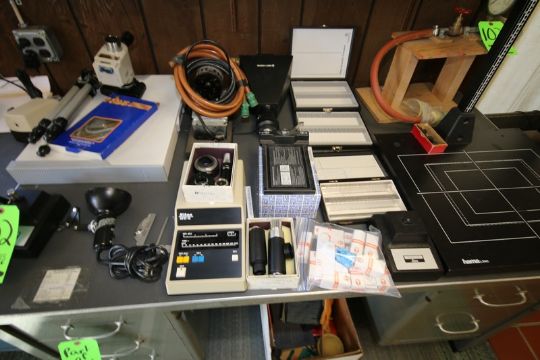 Contents of Desk Top, Includes Copy Stand, Microscope Attachments, Lab Lamps, Nikon AFX-II, Slid Cases, Vacuum Pump, and Other Present Contents