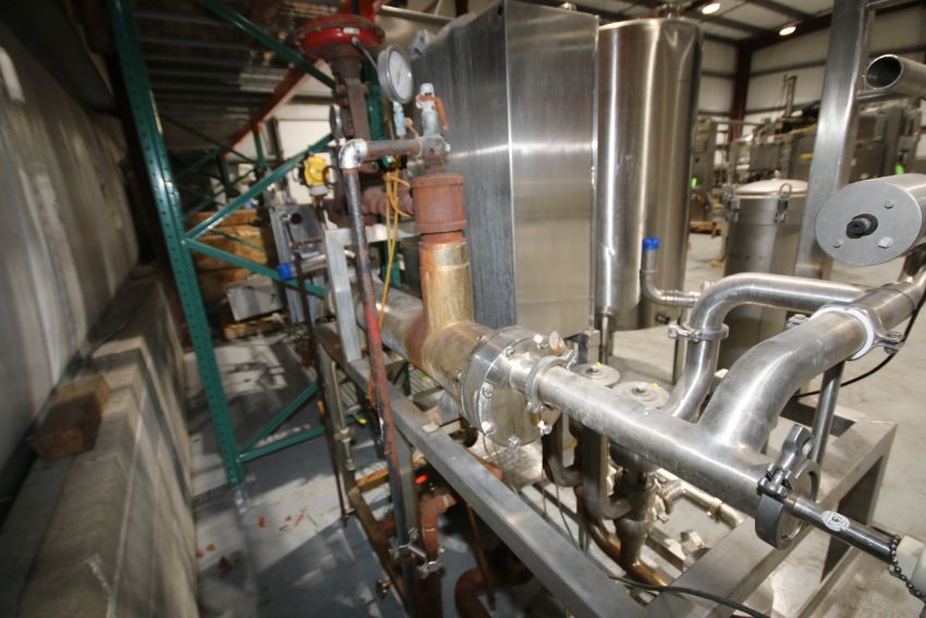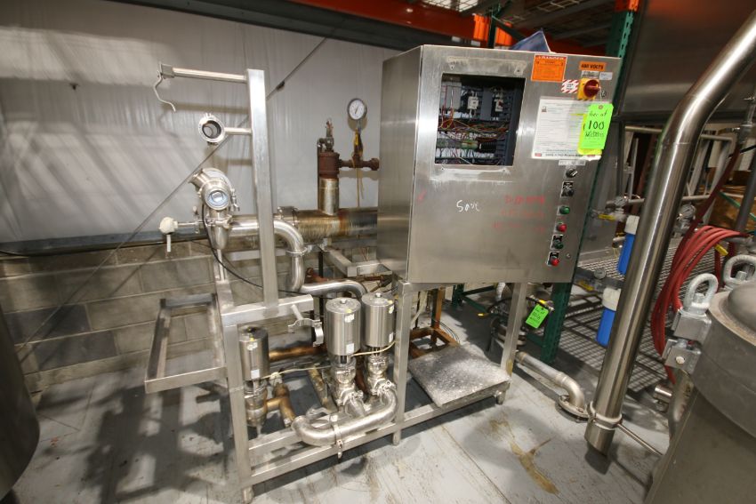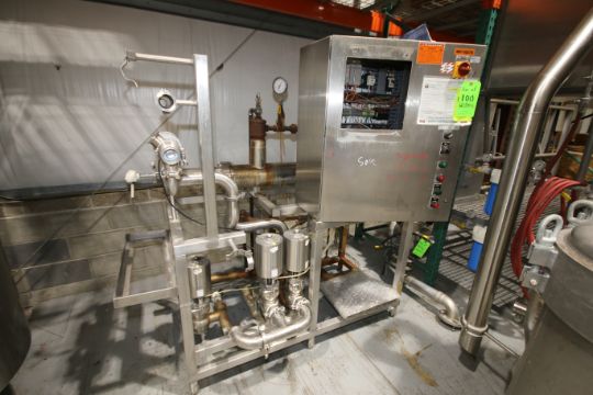 Sani-Matic 2-Tank Skid-Mounted S/S CIP System with (2) 450 Gal. S/S Tanks (Aprox. 60" H x 48" W), Fristam 15 hp Pump, Model FPX3541-205, S/N FPX3541011791 with 2-1/2" x 2-1/2" Clamp Type S/S Head, Aprox. 5 ft. L x 8" W S/S Shell and Tube Heat Exchanger includes Skid-Mounted Control/Air Valve/Heat Exchanger with Aprox. 3 ft. L x 6" W S/S Heat Exchanger, (3) Sudmo and Tri-Clover 2" and 2-1/2" S/S Air Valves and Allen Bradley MicroLogix 1500 PLC Controls (Additional $200 Fee Applies For Packaging & Loading)
