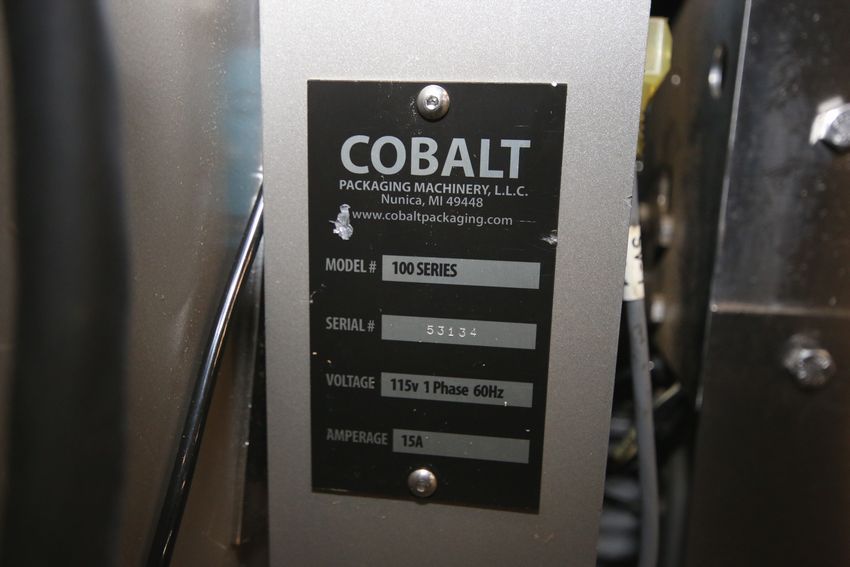 Cobalt Packaging Machinery Semi-Automatic Adjustable Case Former/Bottom Sealer, Model 100 Series, S/N 53134 with Moving Tape Head, Angle Frame includes Top Mounted Aprox. 80" L x 13" W Power Belt Conveyor with Yaskakwa VS Mini VFD, Teco SG2-20KR-D PLC and Additional Yaskawa VS Mini VFD, 115 V, Single Phase, Mounted on Casters (15 CPM) (Additional $100 Fee Applies For Packaging & Loading)