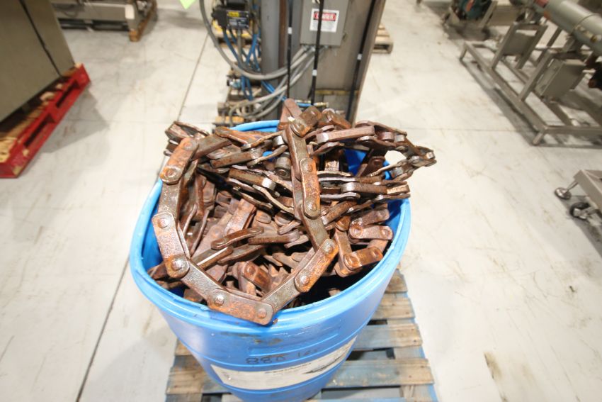 { Choice of lots: 187, 188 } } (3) 55 Gal. Drum Barrels with Rex 3500 Case Conveyor Chain - Aprox. 2,344 lbs. (Additional $50 Fee Applies For Packaging & Loading)