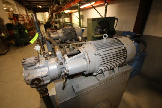 Nott Co. Hydraulic System with (2) Parker 30 hp Hydraulic Pumps, Model PAVC1002R222 1760 RPM, 208-230/460 V, 3 Phase with Aprox. 35" W x 6 ft. L x 31" H Reservoir includes (2) Cutler Hammer Control Boxes (Additional $50 Fee Applies For Packaging & Loading)