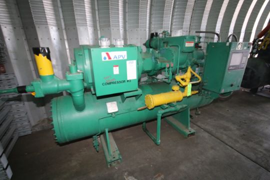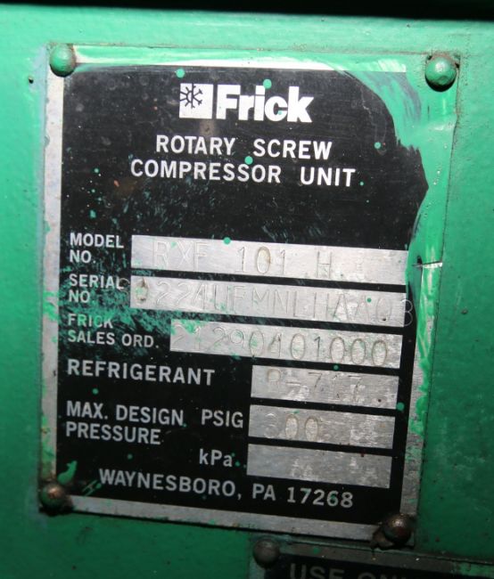 { Choice of lots: 108, 109 } } 2000 Frick 263 hp Screw Ammonia Compressor, Model RXF101H, S/N 0224UFMNLHAA03, Frick Sales #21290401000 with 300 psig, Ram 3560 RPM Motor, 460 V, 3 Phase, Frick Quantum LX Touchpad Display and Control Panel (Overall Dimensions Aprox. 10 ft. L x 67" W x 72" H) (Additional $750 Fee Applies For Packaging & Loading)