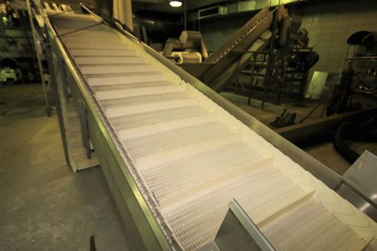 16 ft. L S/S Inclined Conveyor System, with 24" W Intralox Belt with 8" Flights, Siderails, SKK Drive, up to 65" H Leg Supports