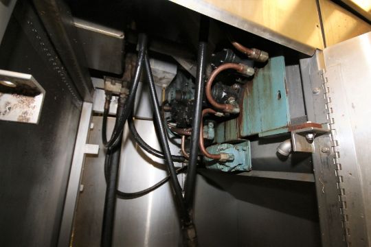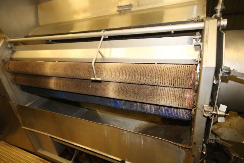 Vanmark Peeler / Scrubber / Washer, S/N 027457044099902, with (8) Roller Positions, S/S Paddle, All Hydraulic Driven, Water Spray Heads, S/S Enclosed Covers, Mounted on S/S Frame, Infeed Chute, Includes 25 hp Hydraulic Pump with Reservoir