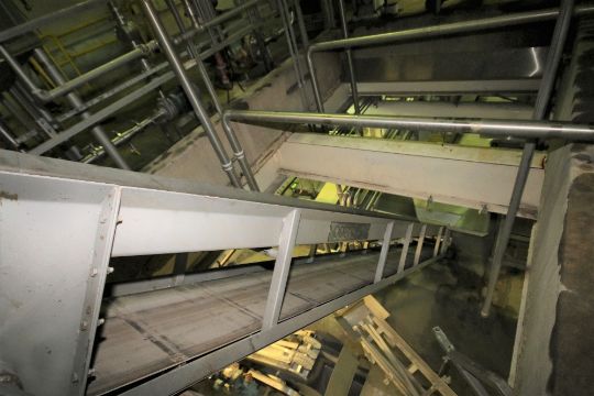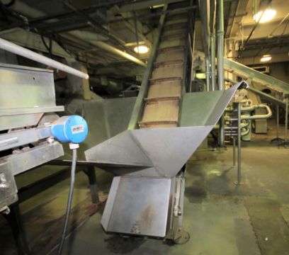 Odenberg 25 ft. L S/S Inclined Belt Conveyor / Hopper System with 23" W Belt, 19" Flights, Side Rails, 75" W x 78" Bottom Mounted Hopper, Top Chute, SEW Electric Drive & Square D Switch
