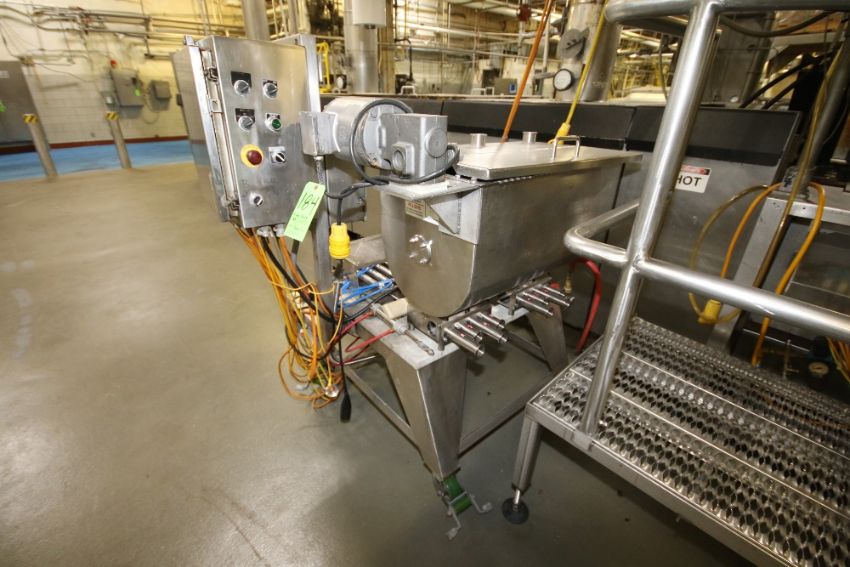 { Group of lots: 183, 184 } } } Hinds Bock 8-Head S/S Depositor with ~30" L x 17" W x 19" Deep S/S Ribbon Blender Mounted on Portable Frame