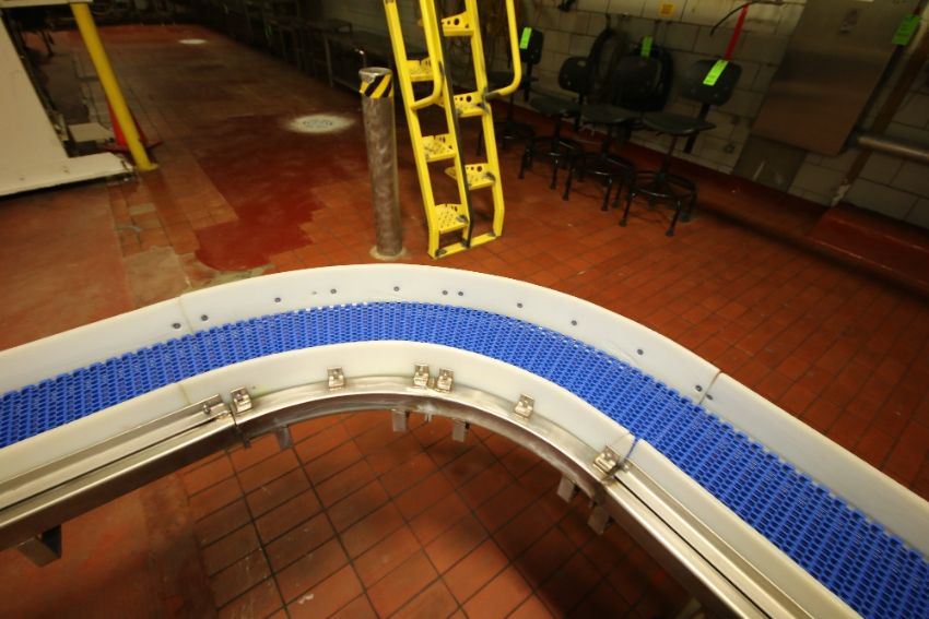 { Group of lots: 283, 284, 285 } } ~30 ft. L J-Configuration S/S Conveyor with 9" W Intralox Belt, Teflon Side Walls, Drive and S/S Legs