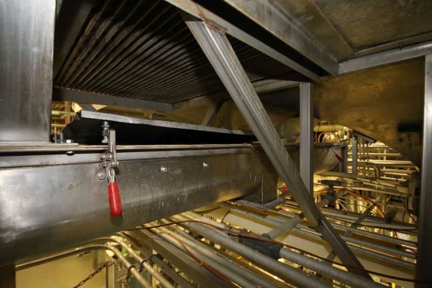 { Group of lots: 55, 56, 57, 58, 59 } } } S/S Cone-Bottom Batter Hopper with Dual Compartment 150" L, 8" S/S Auger System and Baldor 2 hp Motor, 1755 RPM, Overall Dimensions ~73" L x 61" W x 100" H (Pancake Bin #2)