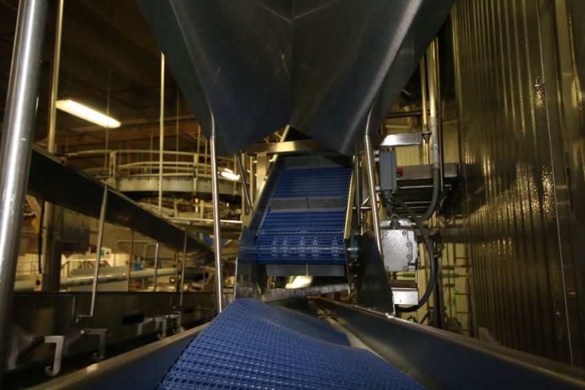 { Choice of lots: 131, 132 } } } ~15 ft. L S/S Outfeed Conveyor for Freezer #1 with 14" W Belt, Incline with Flights with 14" H Between Flights, S/S Hood, S/S Legs, (2) Drives, S/S Drain Pans includes L-Shaped S/S Platform with S/S Ladder