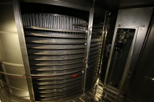 { Choice of lots: 128, 129 } } } 2011 GEA AeroFreeze S/S Spiral Freezer, Model M-Series, S/N 00176A-001-01 with Dual Belt System, ~4" Belt Spacing with (4) 2011 GEA S/S Single Fan Freezer Blowers, All S/S Enclosure, (2) Infeed and Outfeed Conveyors including (2) Tension Towers, Box Dimensions ~34 ft. 8" L x 21 ft. 5" W x 18 ft. 3" H, Spiral Height ~15 ft. H, Belt Width ~32" W with Built-In E-Chem CIP System, McClean Cooling System, Model T431016G102, SKF Lubrication System and Allen Bradley CompactLogix L43 PLC Controls, (9) Allen Bradley PowerFlex 70 VFD's, Allen Bradley PanelView Plus 1000 Touchpad Display including Internal Conveyor Control Panel Located by Freezer 2 (Freezer 1)