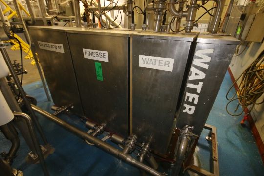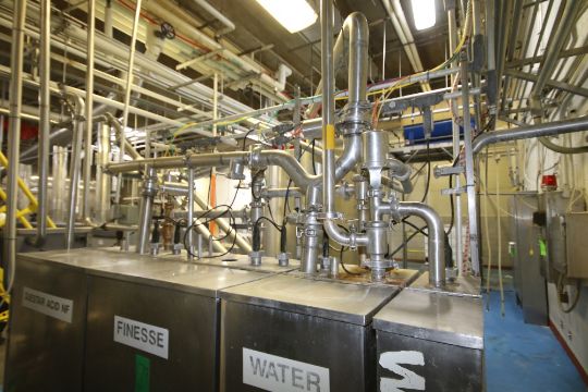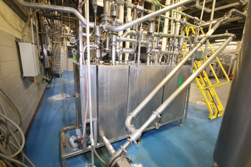 3-Rectangular S/S High Pressure S/S CIP System includes ~500 Gal. S/S Holding Tank, (4) Cherry Burrell Air Valves, (3) Butterfly Valves, (2) Ampco 15 hp Centrifugal Pumps with Sterling 3510 RPM Motors includes Surrounding S/S Piping, Fittings and Flowverter Station