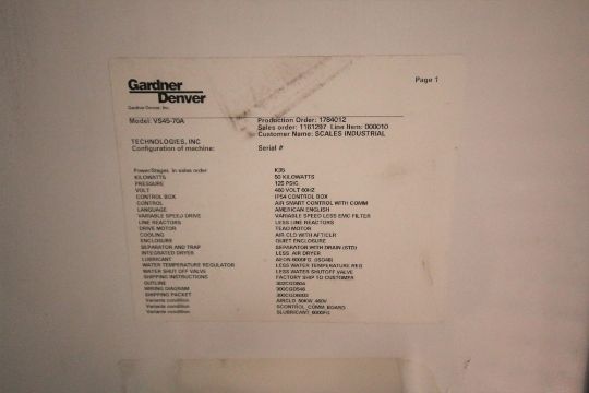 { Choice of lots: 256 } } 2010 Gardner Denver 50 KW (67 HP) V Series Screw Compressor, Model VS45-70A, Product Order #1784012, Sales Order #1161297, Allen Bradley PowerFlex 400 VFD, 125 PSIG, Metered Hours 6,138 hrs. (Compressor #1)