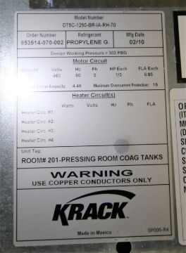 { Group of lots: 221, 222 (P) } } 2010 Krack 5-Fan Propylene Glycol S/S Evaporator/Blowers, Model DT5C-1250-BR-1A-RH-70, Order #853514-080-000A, S/N MY10B005332 and Model DT5C-1250-BR-1A-RH-70, Order #853514-070-00A, S/N MY10B005331 -- 1/3 hp Each, 460 V, 3 Phase (Located Cheese Vat/Pressing Room)