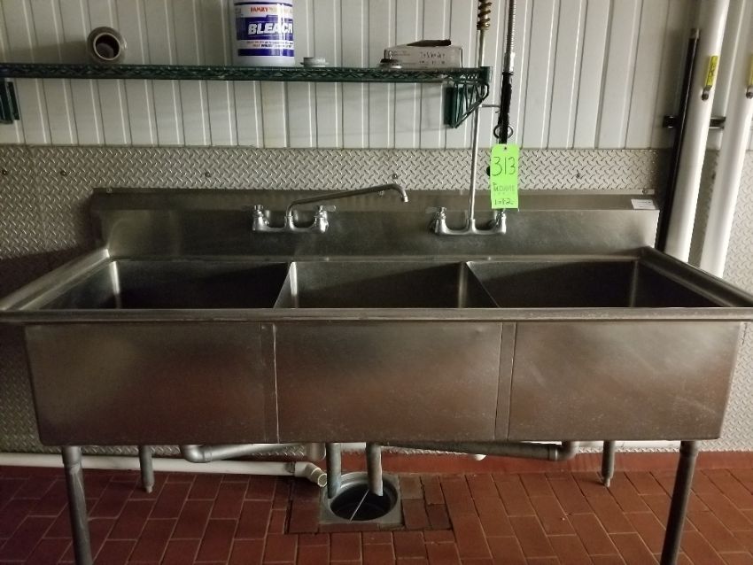3-Bowl S/S Sinks with (2) Faucets and Sprayer, Overall Dimensions ~6 ft. L x 30" W (1) Located Cheese Vat Room and (1) Located Leaf Pasteurization Room #172)