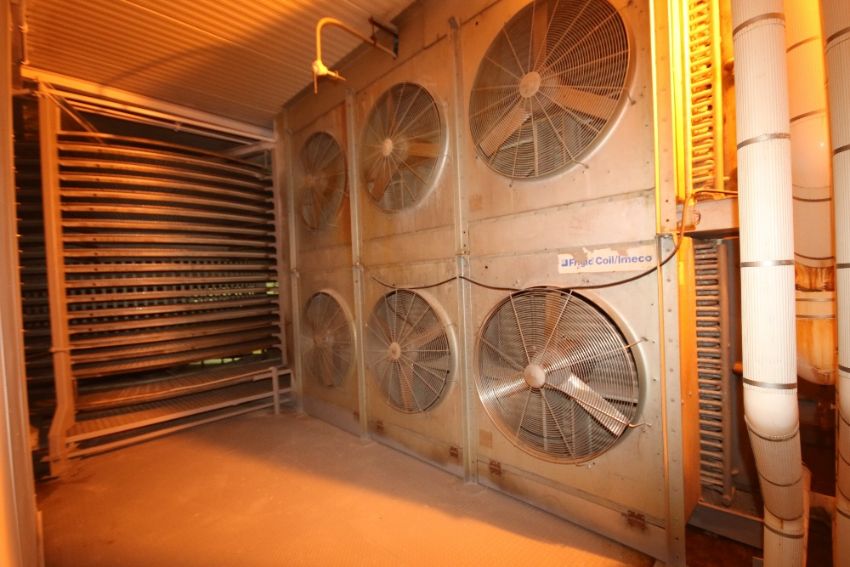 Northfield Tandem Spiral Freezer System, 1st Column with 16 Tier @ 3.5? Spacing, 2nd Column with 7 Tier @ 11 3/4? Spacing, Includes Late Model Belts, Steel Frame Constructed, Allen Bradley SLC 5/03 PLC Controls, Toshiba VFD, Model Tosvert-130 and (4) Imeco Frigid Coil 3- Fan NH3 Evaporator Blowers (Located By Brine Room)