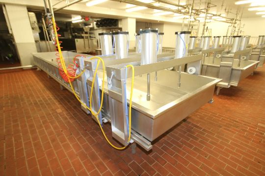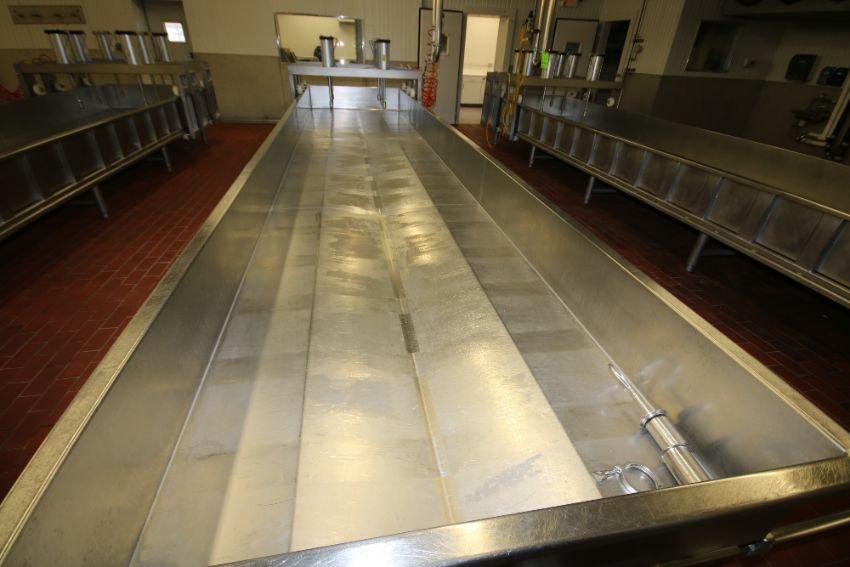 { Choice of lots: 106, 107, 108, 109 } } 2010 Kusel ~1,000 Gal. S/S Cheese Pressing Vat, Model SWPV, S/N 0410SWPV246014-6-1 with 3 – Station @ 2 Cylinder Top Mounted Vertical Pneumatic Press Vat Dimensions ~24 ft. L x 5 ft. W x 14" H