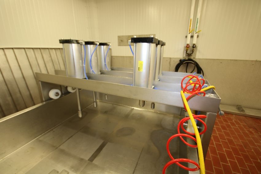{ Choice of lots: 106, 107, 108, 109 } } 2010 Kusel ~1,000 Gal. S/S Cheese Pressing Vat, Model SWPV, S/N 0410SWPV246014-6-4 with 3 – Station @ 2 Cylinder Top Mounted Vertical Pneumatic Press Vat Dimensions ~24 ft. L x 5 ft. W x 14" H