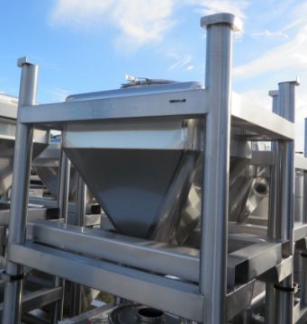 Tote Inc 12 CFT Bin.  90 Gallon Capacity, Stainless Steel.  36" X 30" X 13" Straight Side with a 25" Cone and 10" Diameter Discharge.  Mounted on a Stackable Fork Lift access frame.  18" top-mounted manway.(Located in NJ)***NYINC***