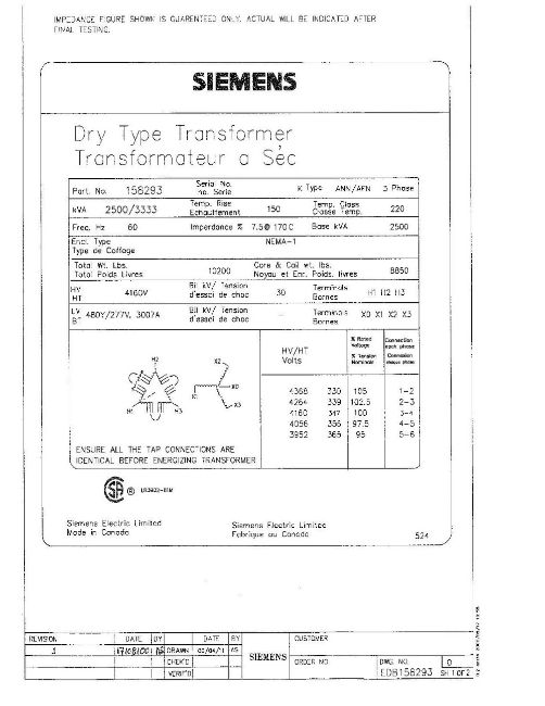 NEW Siemens Hammond Manufacturing 480V 2500/3333 kVA Dry Transformer (NEVER INSTALLED) (Rigging Cost $25.00)”