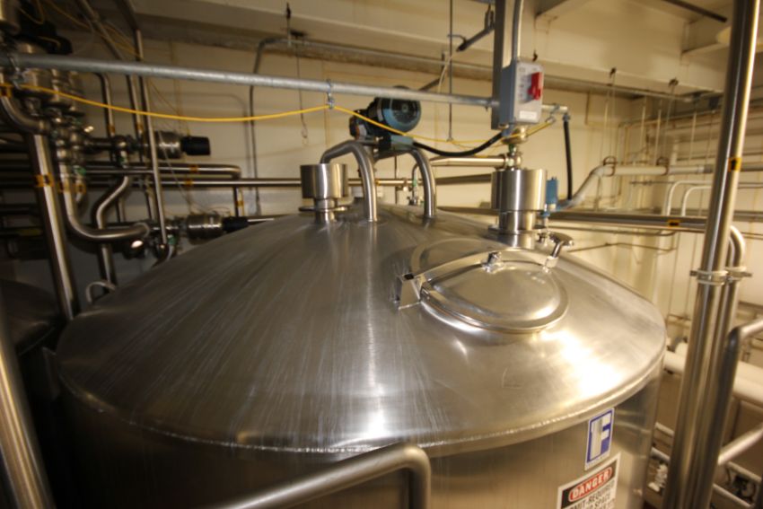 Feldmeier 4,000 Gal. Dome Top Vertical Jacketed S/S Mix Tank, S/N E-294-00, Complete with SEW Vertical Agitator, APV Air Valves, Top Mounted Hinged Door, Sprayballs, Jacket MAWP – 100 psi @ 350 Degrees F, Flat Bottom Suspended on Leg Supports, (Tank Inside Dia. 9 ft. H x 110” W) (NOTE: Rigging Cost $5,000.00)