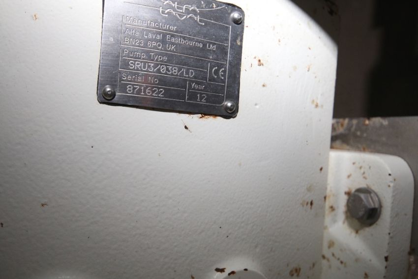 2012 Alfa Laval 2/1.5 hp Positive Displacement Pump, Type SRU3/038/LD, S/N 871622,with S/S Clamp Type 1-1/2" Inlet/Outlet, with Iris FHP S/S Clad 1740/1440 RPM Motor, Mounted on S/S Skid