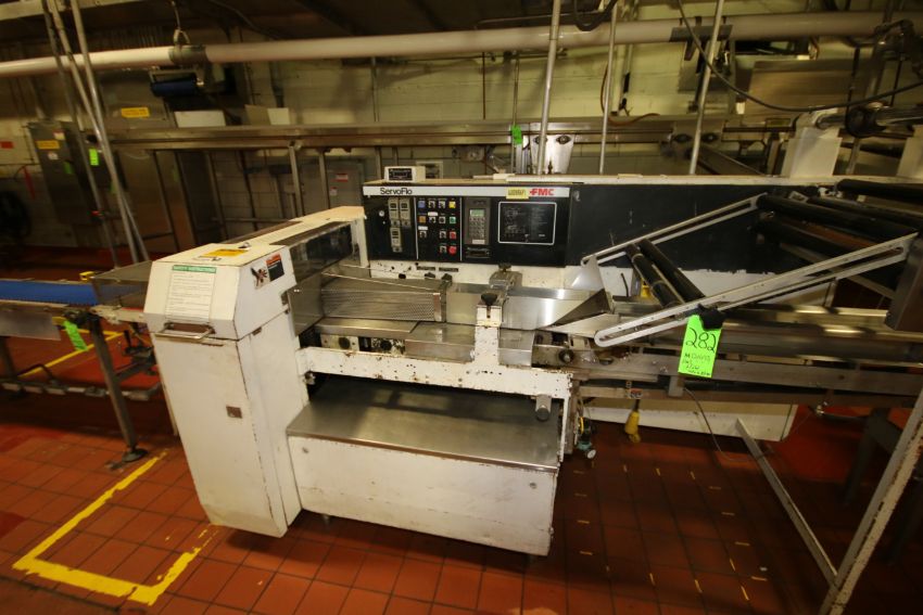 FMC Servo Flo Wrapper, S/N 4244 with Allen Bradley 5/11 PLC Controls, MTE Motion Plus EDC-200 Servo Drive, Utilizes ~30" W Rolls (Rigging Included in Hammer Price)