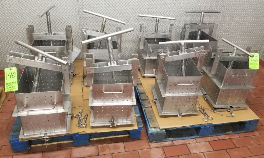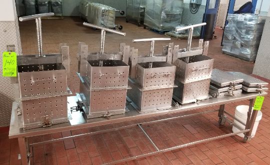 ~11" x 11" x 15" Deep S/S Cheese Pressing Molds on (2) Pallets and (1) S/S Mold Prep Table (NOTE: Table Not Included) (Site #140)
