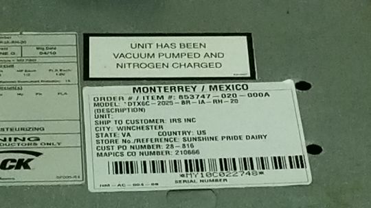 2010 Krack 6-Fan Evaporator/Blower, Model DTX6C-2025-BR-1A-RH-20, Order #853747-020-000A, S/N MY10C022748 (Located in Batch Pasteurizing Room #117) (Site #227)(THIS LOT IS SUBJECT TO THE BULK BID IN LOT 26)