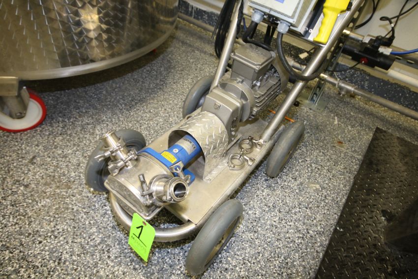 Vigor 5 hp S/S Centrifugal Pump, Model 200 Flexible Impeller, 2" S/S Clamp Type Inlet/Outlet, with SMV Lenze AC Tech VFD, 1725 RPM Motor, 220 V Single Phase, Mounted on 304 S/S Portable Cart (THIS LOT IS SUBJECT TO THE BULK BID IN LOT 14)
