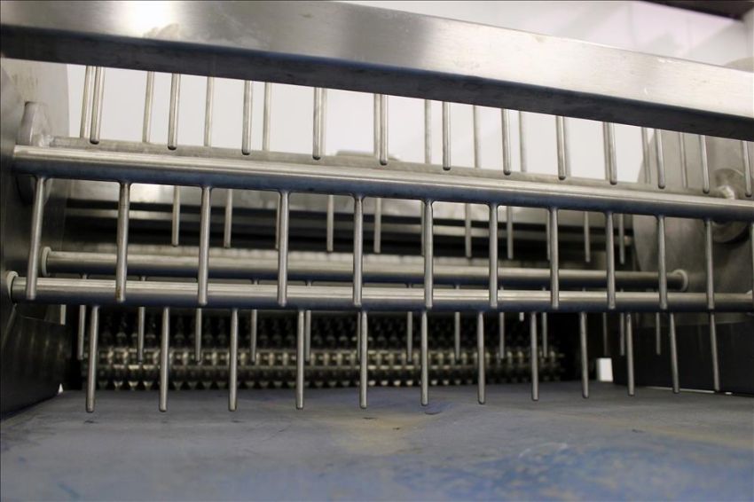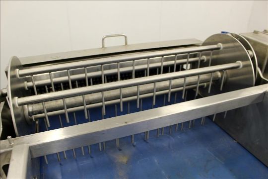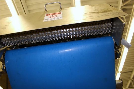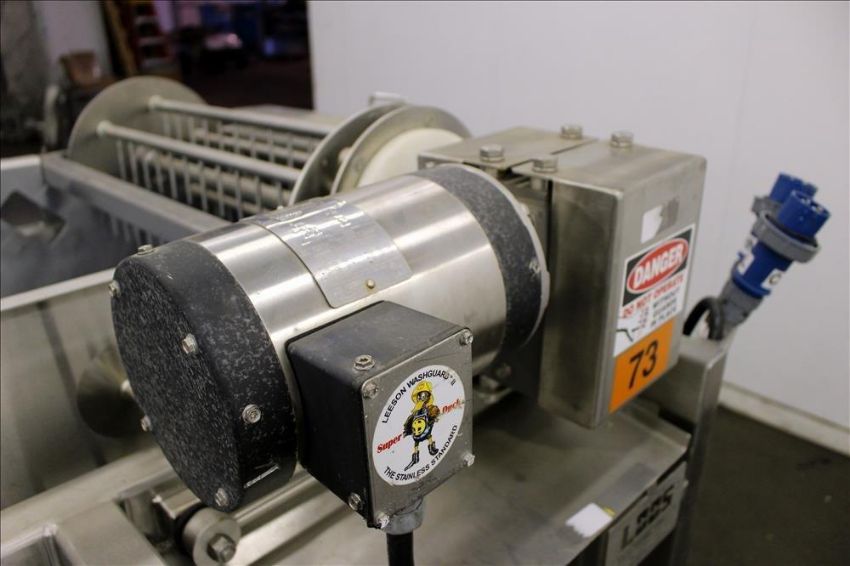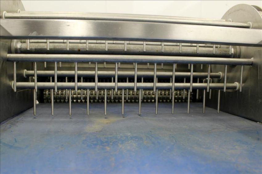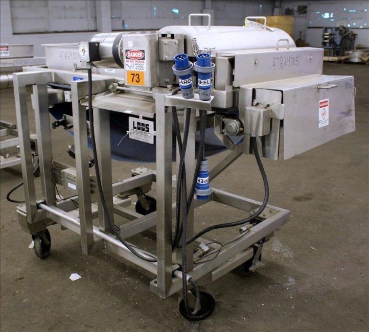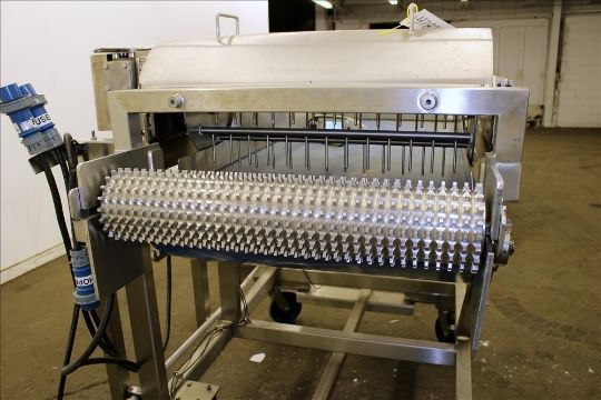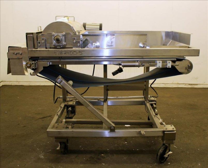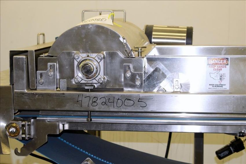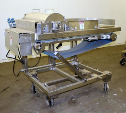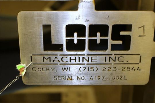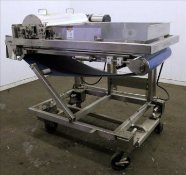 Loos Machine & Automation Waterfall Type Applicator, 304 Stainless Steel. Has approximate 28-1/2" wide x 60" long belt conveyor with 1/2hp self driven roll. Approximate 10" diameter x 27" long carousel driven by a 1hp, 3/60/208-230/460 volt, 1725 gear motor, 50 to 1 ratio. Approximate 6" diameter x 27-1/2" long pinwheel driven by a 1/4hp self driven roll. Mounted on a stainless steel frame with casters. Serial# 4197-1002L(Located in Chicago)***MDGAEK***
