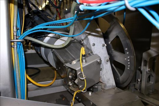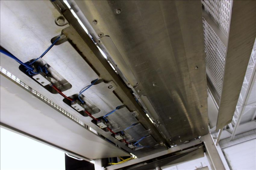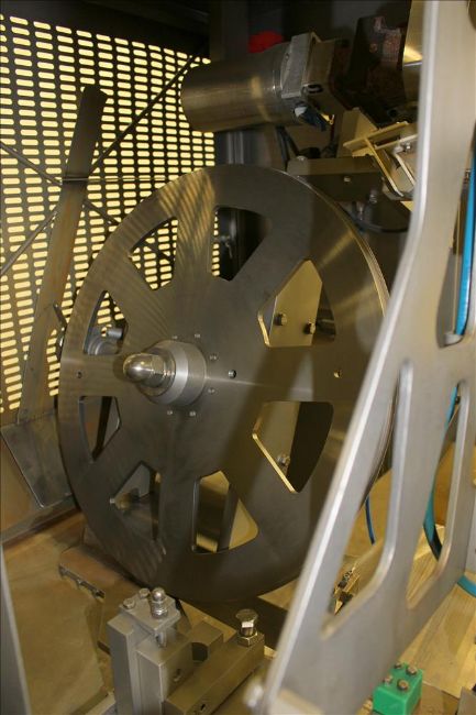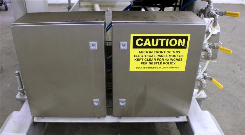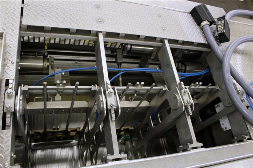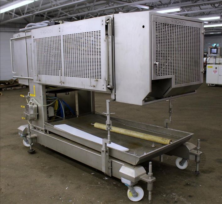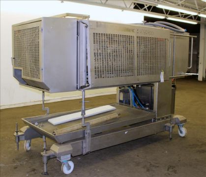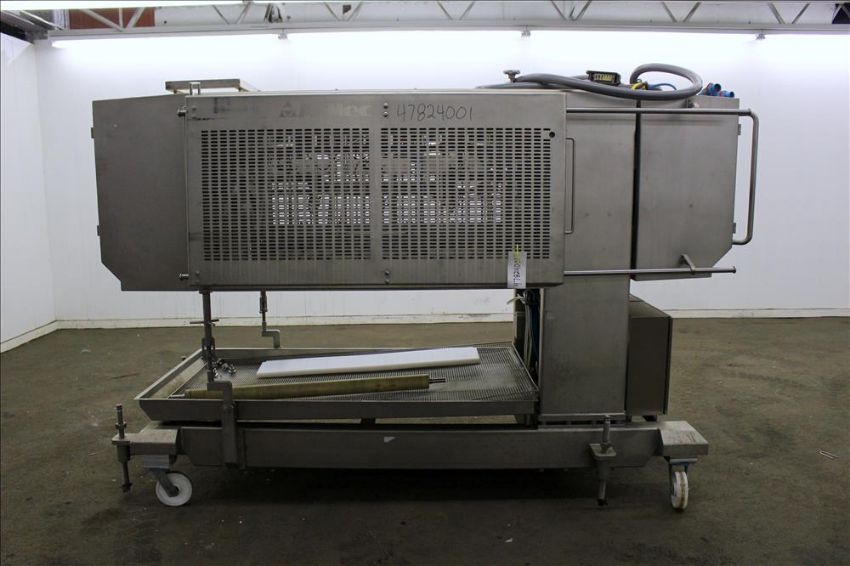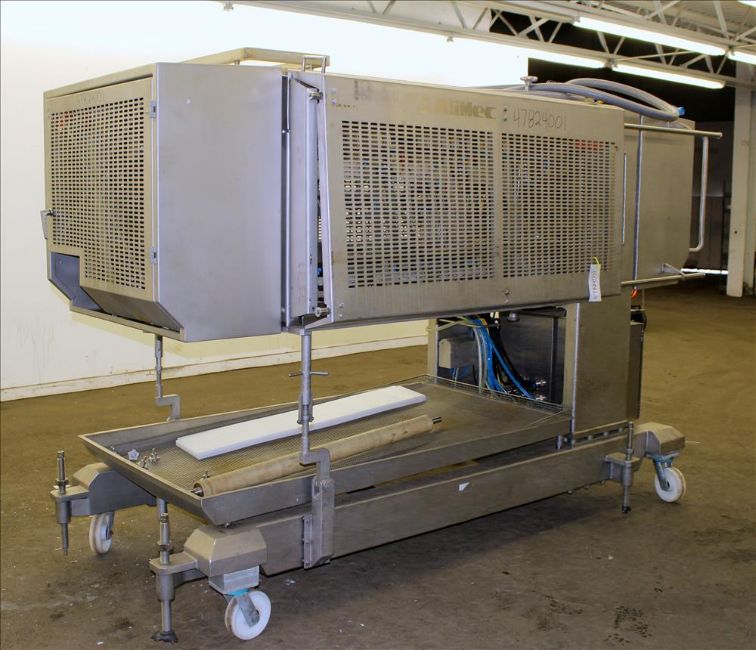 2009 Alimec Food Pepperoni Slicer, Model Slicer,  S/N 628-54, 3 Station, no infeed magazines. Missing blade, blade driven by a 3 kW (4 hp), 3/60/240/480 volt, 870 rpm motor. Bottom drain pan. Mounted on a stainless steel frame with casters (Located in Chicago)***MDGAEK***