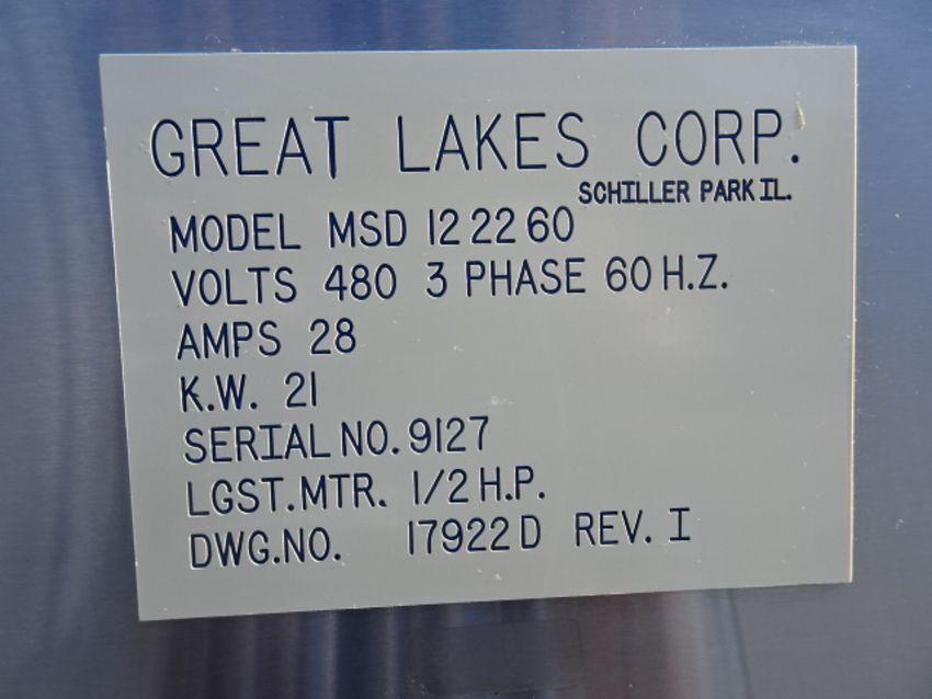 Great Lakes Stainless Steel Heat Shrink Tunnel, Model # MSD 12 22 60, S/N 9127, stainless steel / 60" tunnel length / 12" clearance height / 20" belt width (Located in South Carolina)***NORTH***