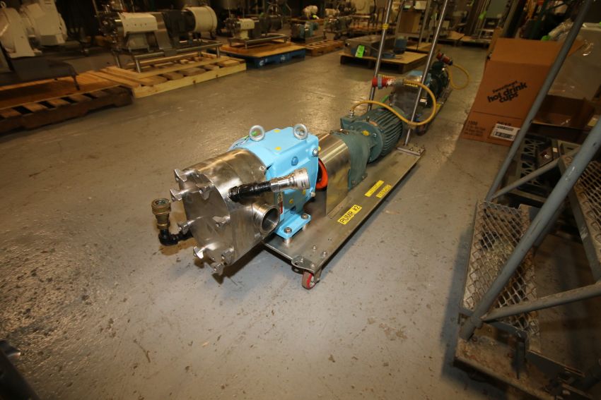 Waukesha Waukesha Positive Displacement Pump, Model 130, SN 233305 99, with 3" Clamp Type S/S Jacketed Head, Includes Rotors, Reliance 5 hp/1750 rpm Drive Motor, 230/460V 3 Phase, Mounted on S/S Portable Frame (Rigging Fee $50)
