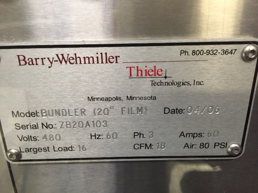 Thiele Shrink Case Bundler, Model ZB20A, S/N ZB20A103, Wraparound Case Bundler (20” Film) and is made of all S/S Construction. This Unit is A Fully Automatic Product Bundling System made up of the Following Sections, the infeed Conveyor Advances the Product Through the Film and into the Seal Bar, A heated knife in the Seal Bar assembly seals a seam in the Film for the Products which are enclosed in Film. At the same time, it seals a seam for the next Products to be advanced Through the Film. the knife cuts between the two seals, releasing the enclosed Products to proceed to the shrink (oven) tunnel on the transfer conveyor. the Products are conveyed Through the shrink (oven) tunnel where heated air circulates to evenly shrink the Film around the Products. Electric 480 Volts, 3 Phase, 60 HZ, 60 Amps, CFM 18, 80 PSI. Unit is in Excellent Operating Condition. Manufactured in 2006 (Located in NY)(***GPIEC***)