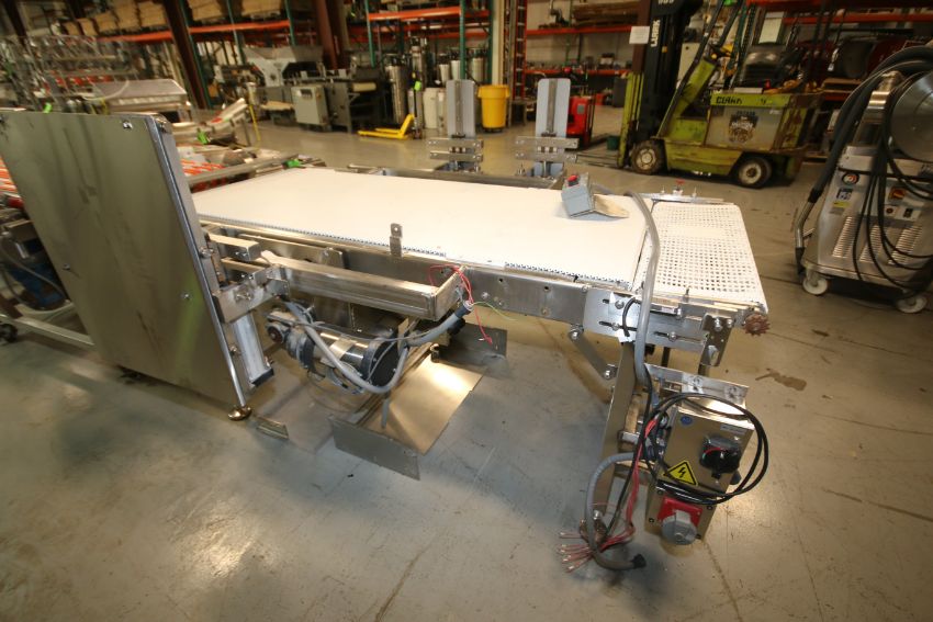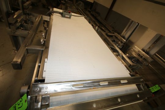 Moline 90" L x 32" W S/S Conveyor System, Model CP-32-SR, SN 05-J 219136, with Intralux Belt, 38" H Frame, Leeson 1 hp / 1725 rpm S/S Clad Drive Motor, 208/230V 3 Phase, Includes 4 Station Mounted Pneumatic Lift Frame Set Up (W424)