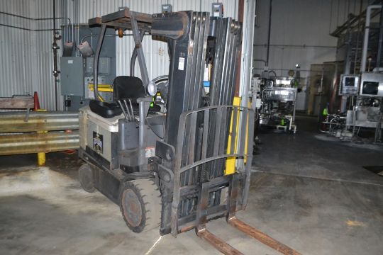 { Choice of lots: 634, 635 } } } } Crown 4,000lb Triple Mast Electric Ride Type Forklift: Model FC4010-50-QUAD 240 S/N 9A149790 with 48 Volt Battery and Charger