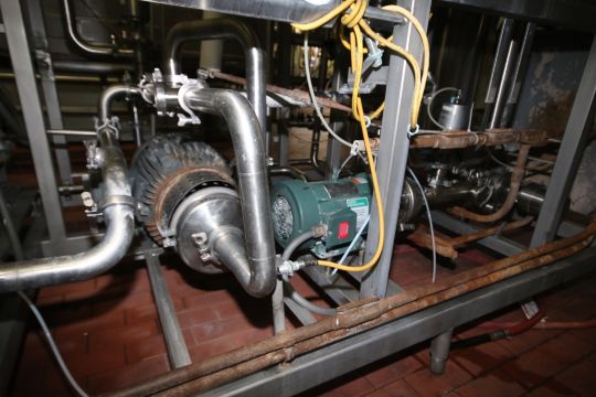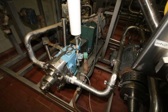 APV Model R51 S/S Juice UHT High Temperature Sterilization System; Waukesha Heat Exchanger has Approx. 240 Plates in 3 Sections; Skid Mounted Components Include Bell & Gossett Shell and Tube Heat Exchanger, S/S Flood Rim Balance Tank with Tri Clover Level Control: APV 5HP S/S Centrifugal Feed Pump. Rosemount Magnetic Flow Meter, APV 25HP CIP System; Waukesa Model U-130 S/S Positive Timing Pump with Direct Drive: S/S Holding Tube on Seperate Stand; Approx. 10 System Valves, and Automated Control Panel with Allen BradleyPanel View 1500 Plus Touch Screen and SLC 5/05 PLC and ABB Recorder Controller