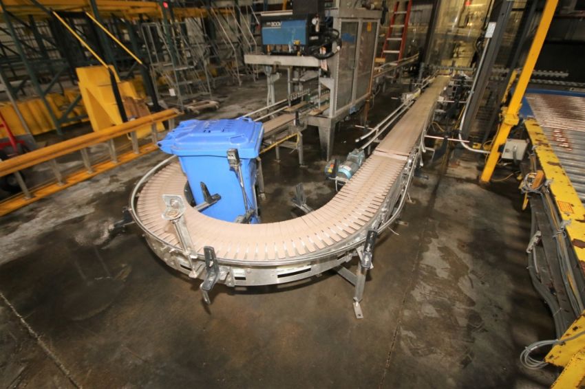 S/S 10" Plastic Chain Conveyor; (2) Sections with Drives: 12ft Section with 180 Degree Turn and Straight Section; 13ft with Drive: From Case Sealer to Palletizer