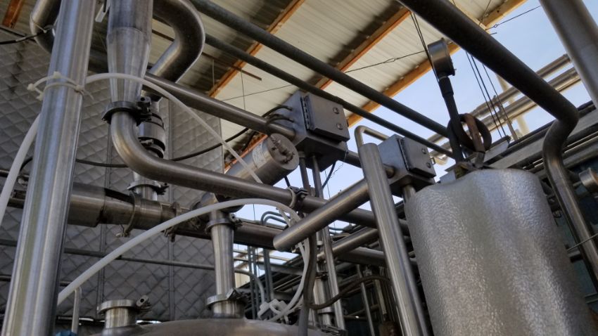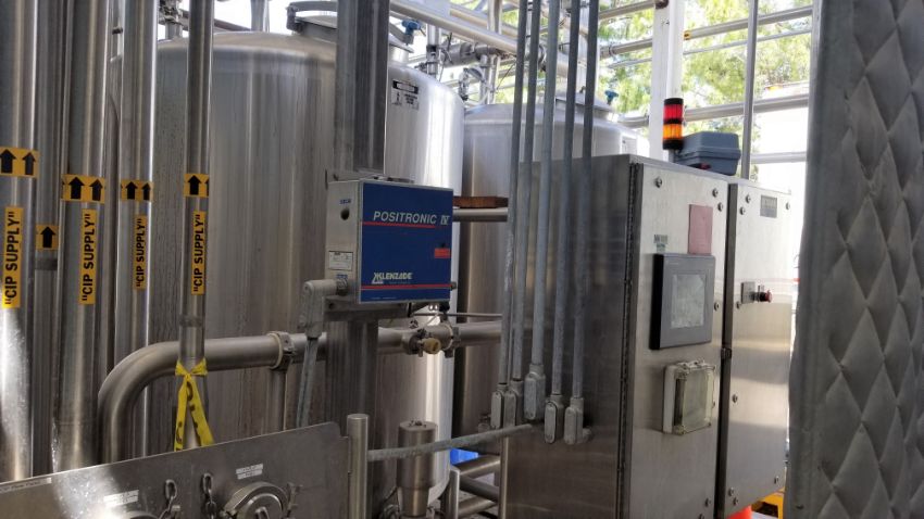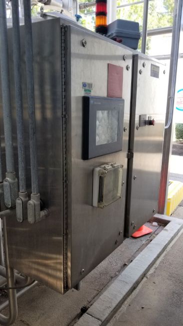 Ecolab 2-Tank Skid Mounted S/S CIP System with 600 Gal. Tanks, (62" H x 56" W), with Top Hinged Lids, LKH 20 hp Centrifugal Pump, Enerquip 65" L x 8" W S/S Shell & Tube Heat Exchanger with Control Valves, (8) Alfa Laval Air Valves, Butterfly Valves, In-Line Filter, Temp Sensors, with Allen Bradley Controls with Touch Pad Display & Chemical Handling System