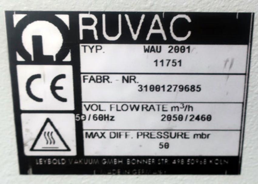 Unused Leybold RUVAC WAU 2001 roots vacuum pump. 50/60 Hz, 10 HP motor. ($75 Loading Fee)