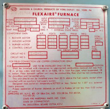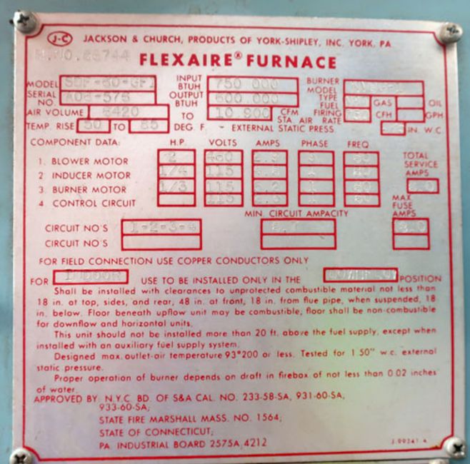Jackson & Church Flexaire Furnace, Model SDF-60-GFI. Input BTU 750,000, Output BTU 600,000. Air volume to 10,900 CFM. Serial # A06-575.($100 Loading Fee)