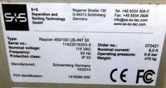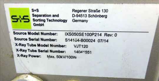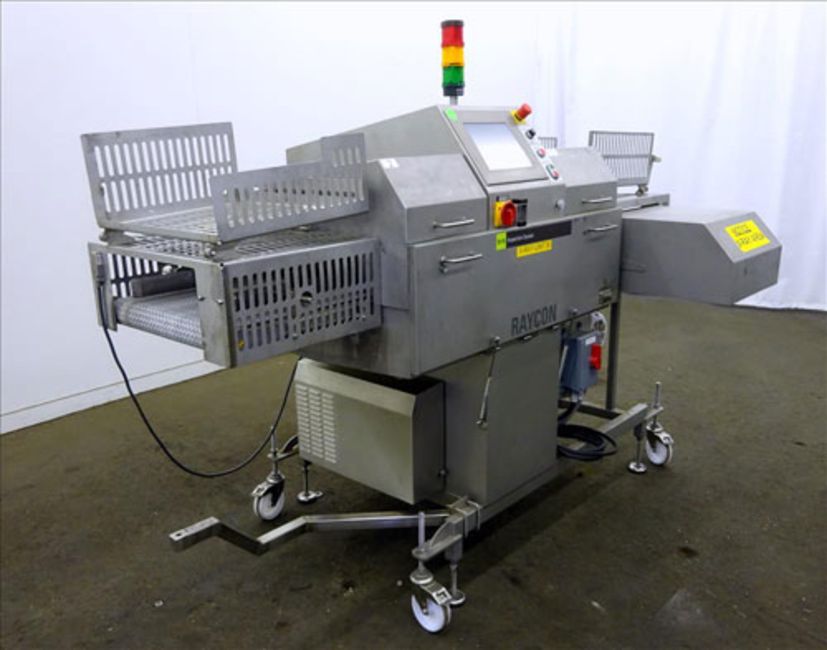 Sesotec Raycon X-Ray Food Inspection System, Type 450/100 US-INT 50. Serial # 11422018353-X. Has an integrated conveyor belt that is designed for use in wet or dry applications and inspects packaged food product for contaminants or other unwanted defects. In-line detection of magnetic or non-magnetic metals, glass, ceramic, stone, bone, PVC, rubber, etc., even in metallic or metal-coated packaging such as foil. The X-ray inspection software is also optimized to identify product defects such as broken, deformed or missing product with minimal operator training. X-Ray Tube Model VJT120, X-Ray Power 50kV/100W. Built 2014.($75 Loading Fee)