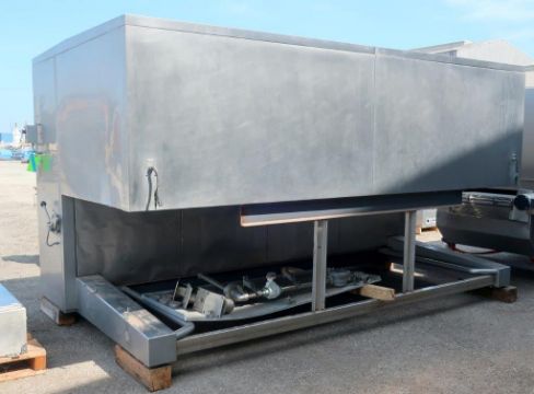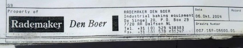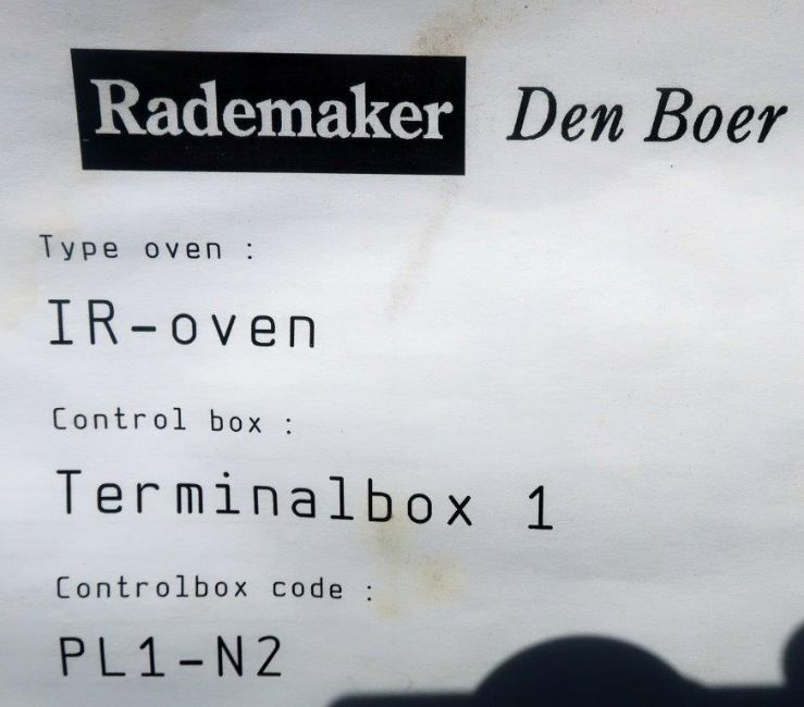Rademaker Den Boer Infra Red Cheese Melting Oven and Conveyor, Natural Gas. "Open Baking Tunnel" with 14 independently-functioning burners, divided into 4 groups which are positioned above the product to be heated. Heat-resistant Product Transport Conveyor Equipped with a Omni-grid Belt. 1000 BTU/ft3 Gross Heating Value. 341 BTU/s Nominal Input Rating. Includes Control Cabinet, Blower, and Various Valves and Piping. Built 2005. Rigging and loading fee; $1000.00