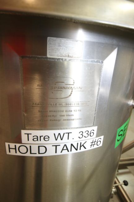 2012 Sprinkman 150 Liters S/S Mix Tank, S/N N4083C, Vessel Rating: Atmospheric, with Top Mounted Agitation, Baldor 5 hp S/S Clad Motor, 1765 RPM, 208-230/460 Volts, Includes Allen Bradley PowerFlex 4M VFD, Mounted on S/S Frame with Fork Placements (Rigging & Loading Fee $250.00) (Located in Pittsburgh, PA)